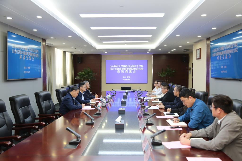 在山东煤田地质规划勘察研究院(简称 研究院),与研究院院长黄兴龙、副书记鲁楠、副院长张晖等人进行了座谈,涂锐首先就双方进行实验室共建提出了期望,黄兴龙全面介绍了研究院在矿产综合勘查、地球物理探测、非常规能源勘查、生态环境修复、海洋地质等领域的研究成效及科研激励政策等。依托实验室平台,双方就进行科技奖励、科技项目、知识产权等方面的共同申报以及人才梯队的共同培养进行了深入交流,并在矿山生态修复监测与评估、遥感地质找矿、全息地质资料数字化及信息挖掘、广域地表沉降监测、海洋地质环境监测等方向进行了深入探讨,并就进一步深化合作达成共识。
