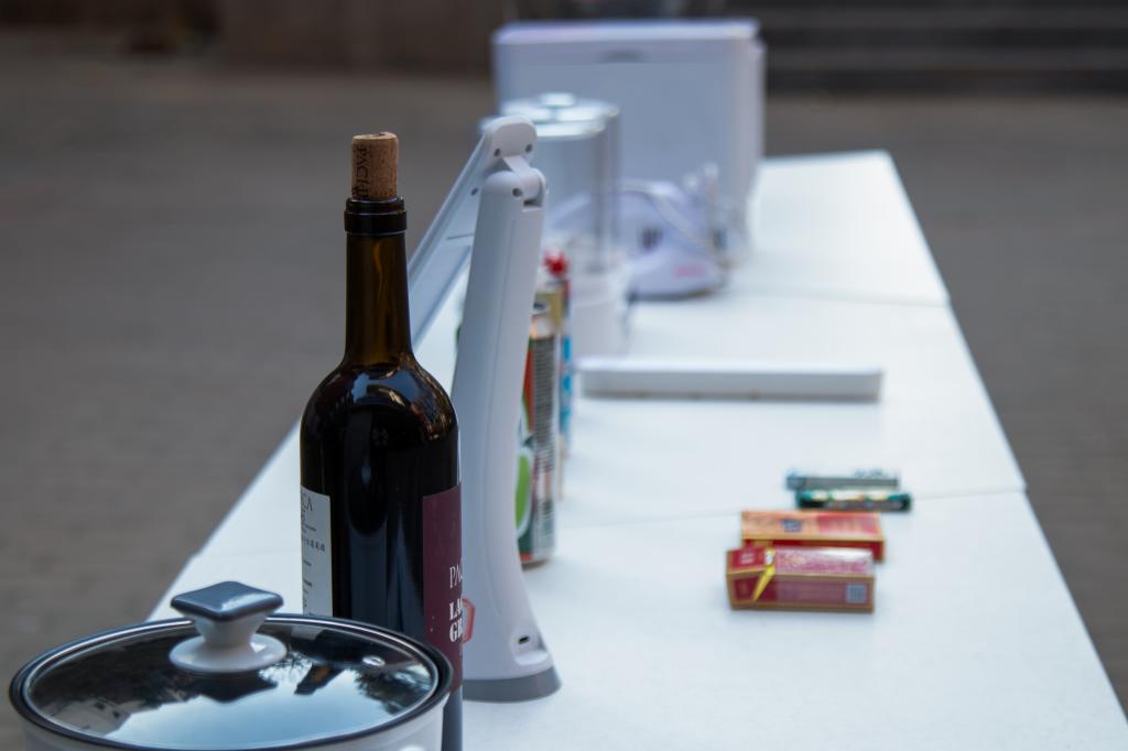 活动现场,自律会成员精心布置展示区,将大功率电器(如热得快、电暖器、电磁炉)、违规充电设备、管制刀具、易燃易爆物品等常见公寓违禁物品分类陈列,并搭配清晰的文字说明。不少同学驻足围观,认真聆听工作人员的讲解,对看似“实用”却暗藏风险的违禁物品有了更直观的认知。“原来小小的劣质插线板可能引发短路起火,之前都没意识到这么危险”,一位同学在参观后说道。