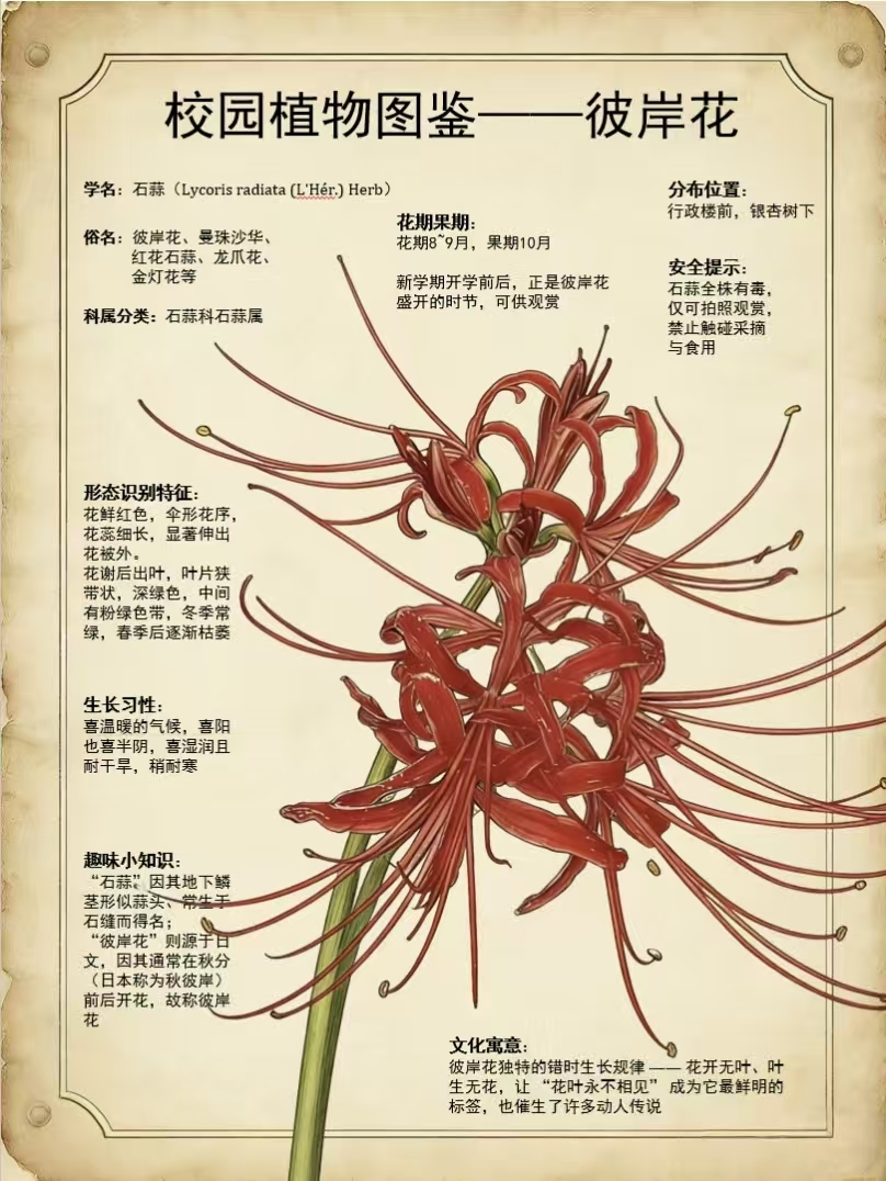 本次活动以植物图鉴卡形式征集作品,参赛同学围绕植物名称、科属分类、形态特征、生长习性、校园分布位置等内容进行设计,并结合原创摄影、手绘作品等视觉素材完成创作。作品征集结束后,研究生会依据主题契合度、创意性、完成度、美观度、记录完整性等多个维度进行综合评审,最终评选出一等奖3名、二等奖10名、三等奖17名。